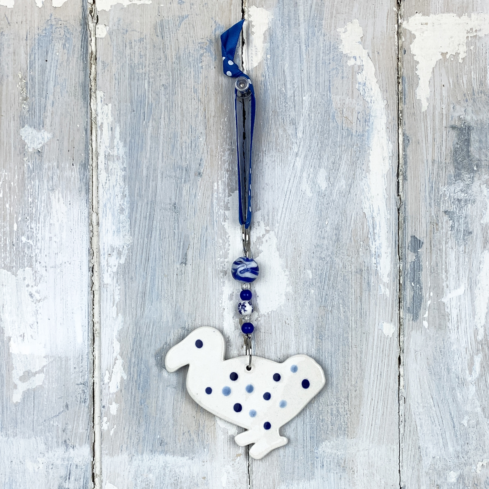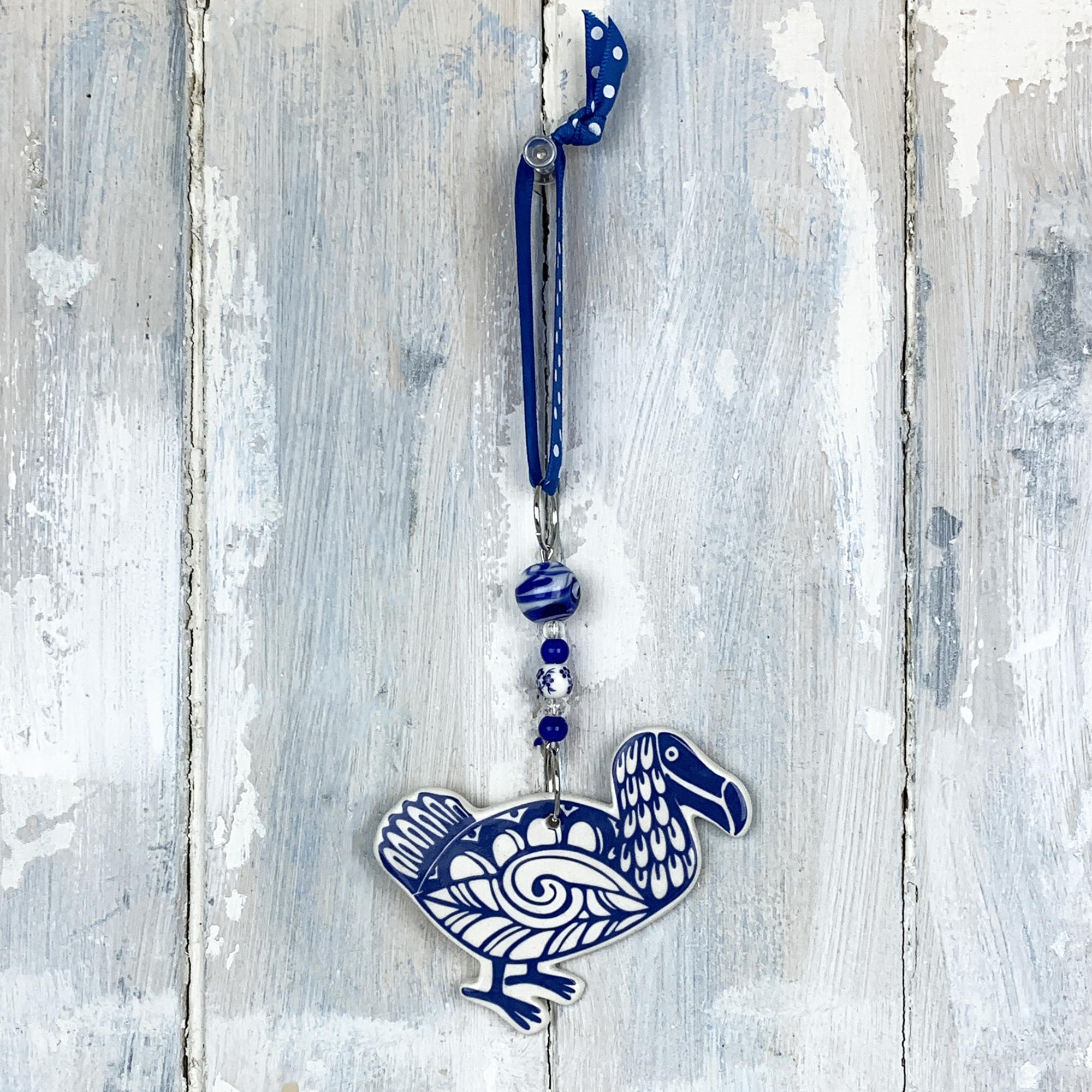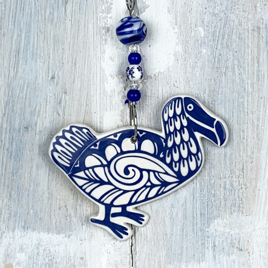 This ceramic Dodo hanging decoration is handmade in the UK and finished with matching beads and ribbon. Measuring approx. 8 cm tall, 8 cm wide, 4 mm thick and decorated on both sides (dots on reverse).