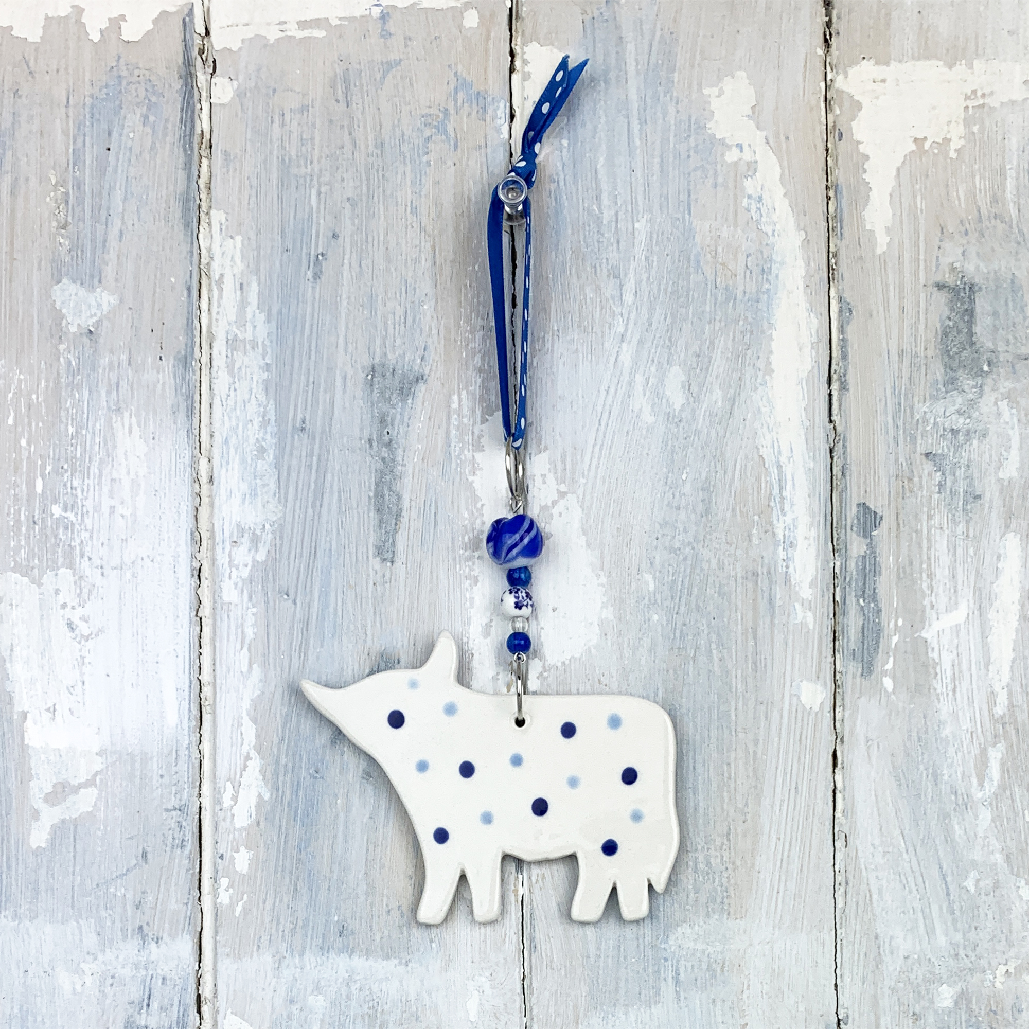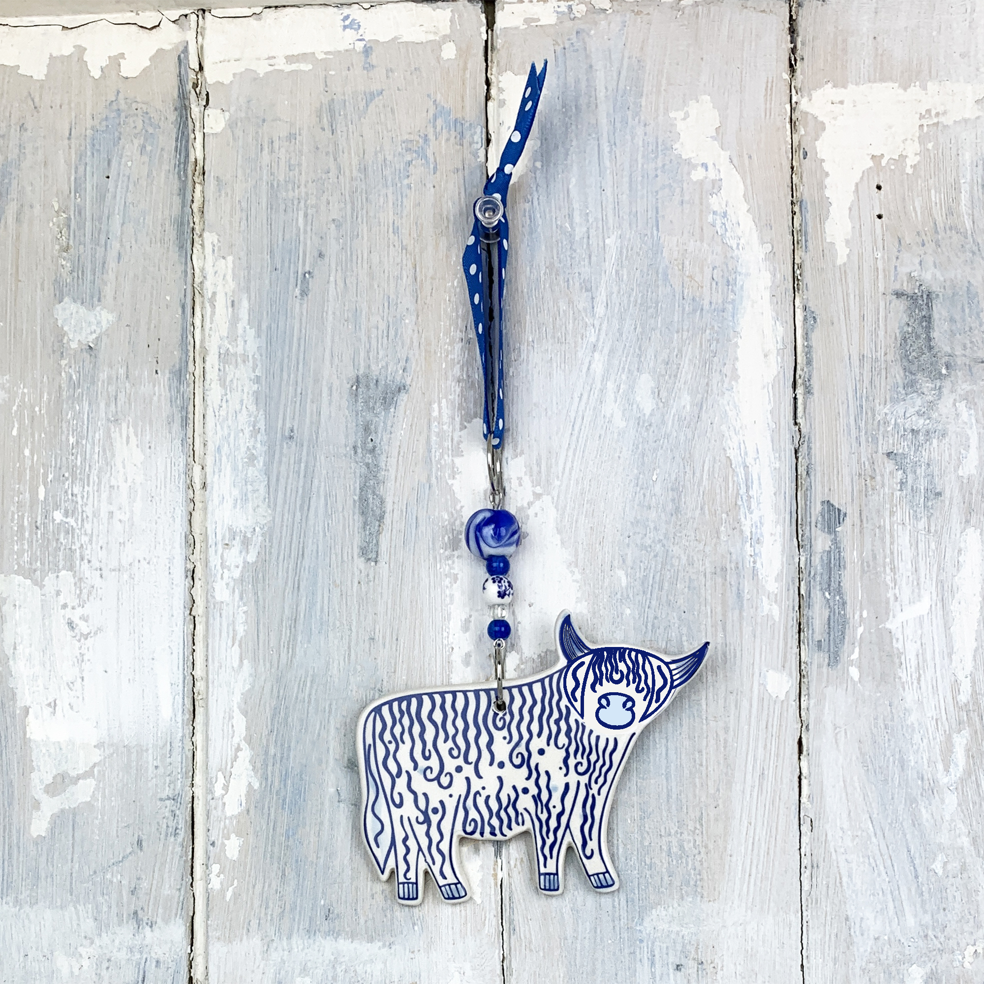 This ceramic Highland Cow hanging decoration is handmade in the UK and finished with matching beads and ribbon. Measuring approx. 7 cm tall, 9 cm wide, 4 mm thick and decorated on both sides (dots on reverse) all of our hanging decorations are hand cut and beautifully hand decorated at our Berkshire based studio.