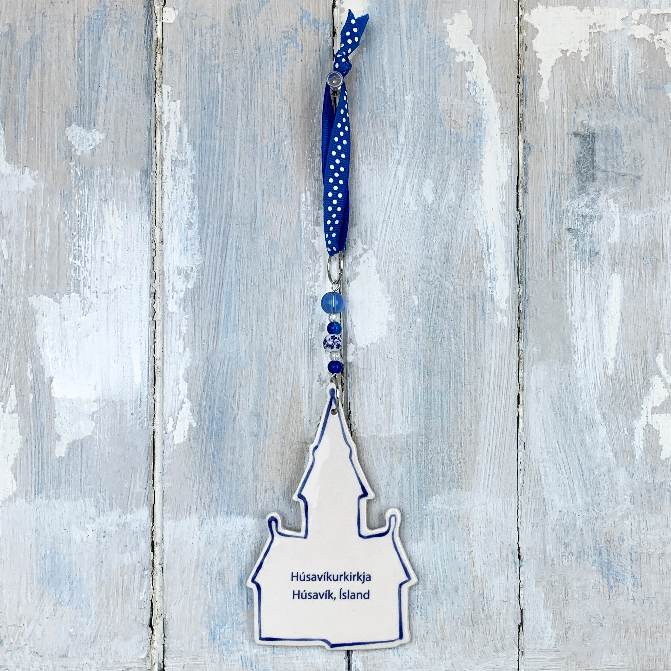 Roelofs & Rubens handmade and hand decorated blue Husavikurkirkja Husavik Island decoration is exclusive to their gift shop, Hafnarstétt 1, 640 Húsavík, Iceland. Click here for the website.