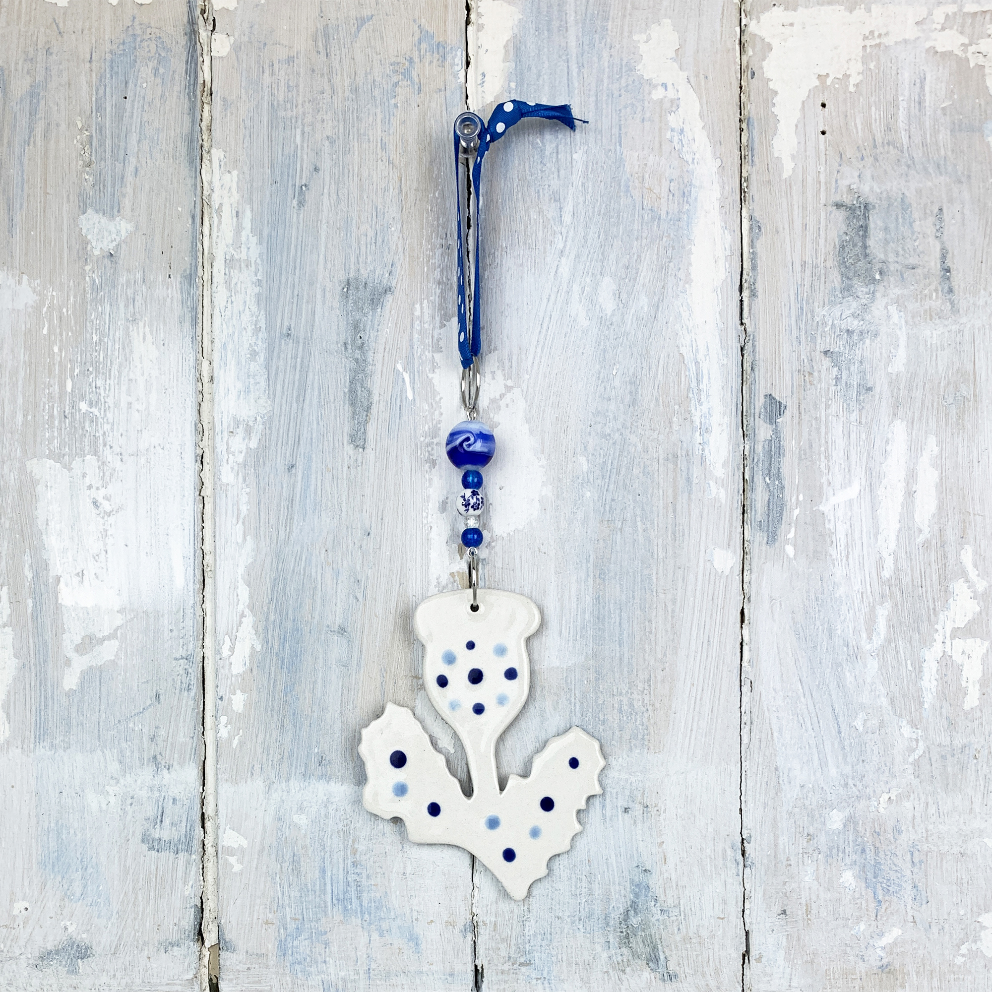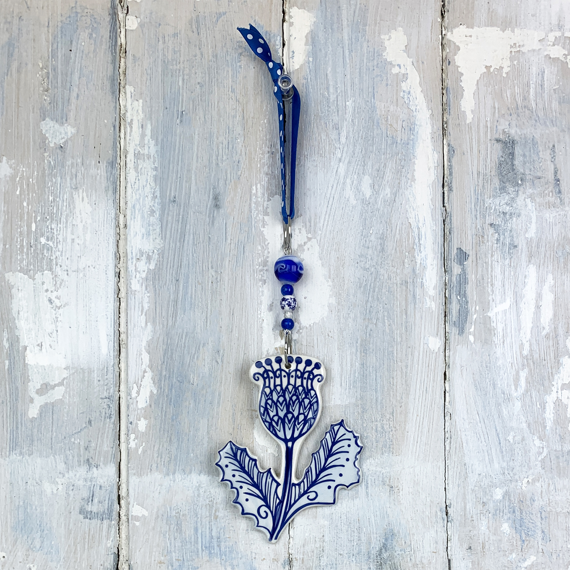 This ceramic Thistle hanging decoration is handmade in the UK and finished with matching beads and ribbon.