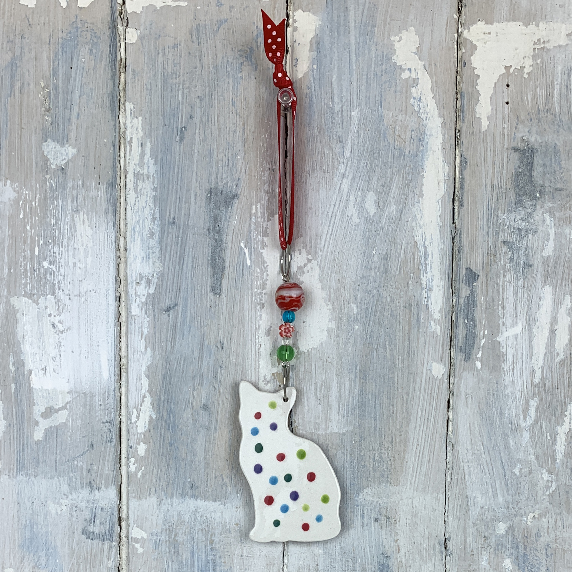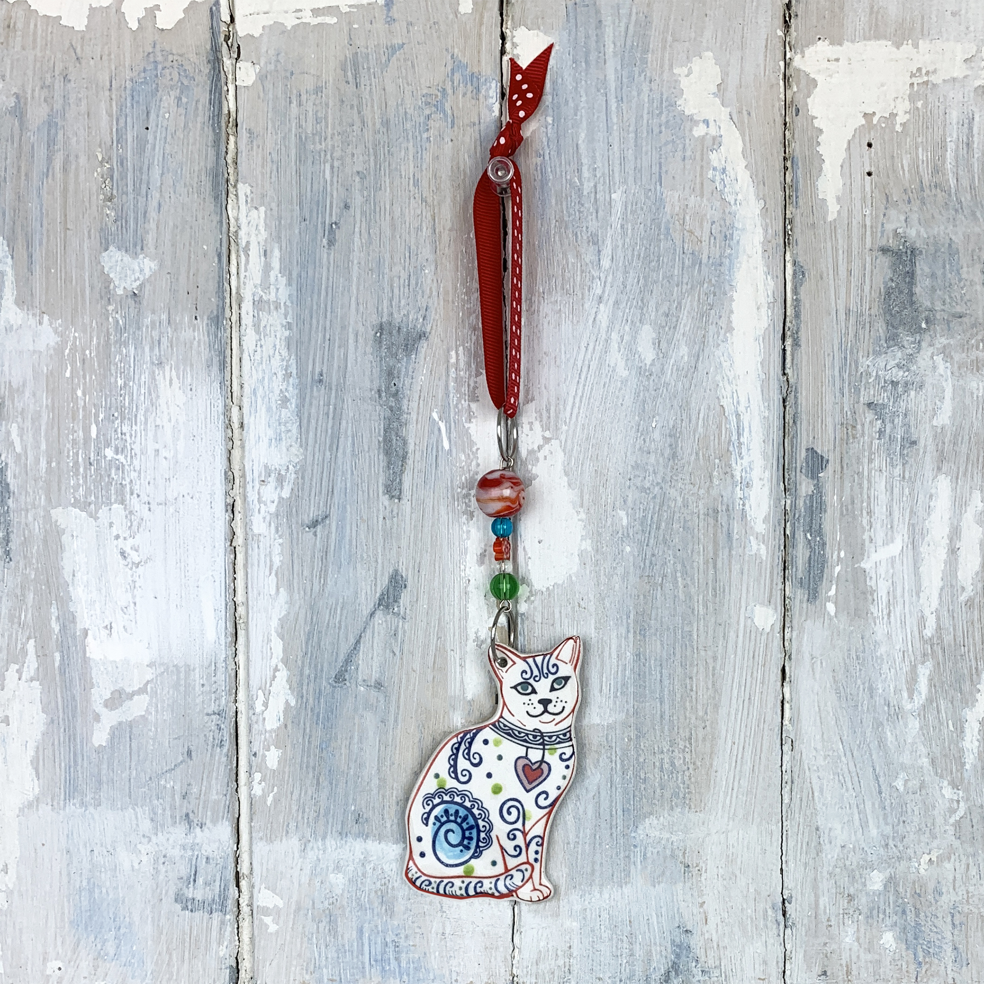 This ceramic Cat hanging decoration is handmade in the UK and finished with matching beads and ribbon.