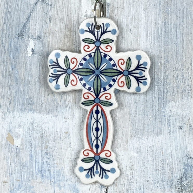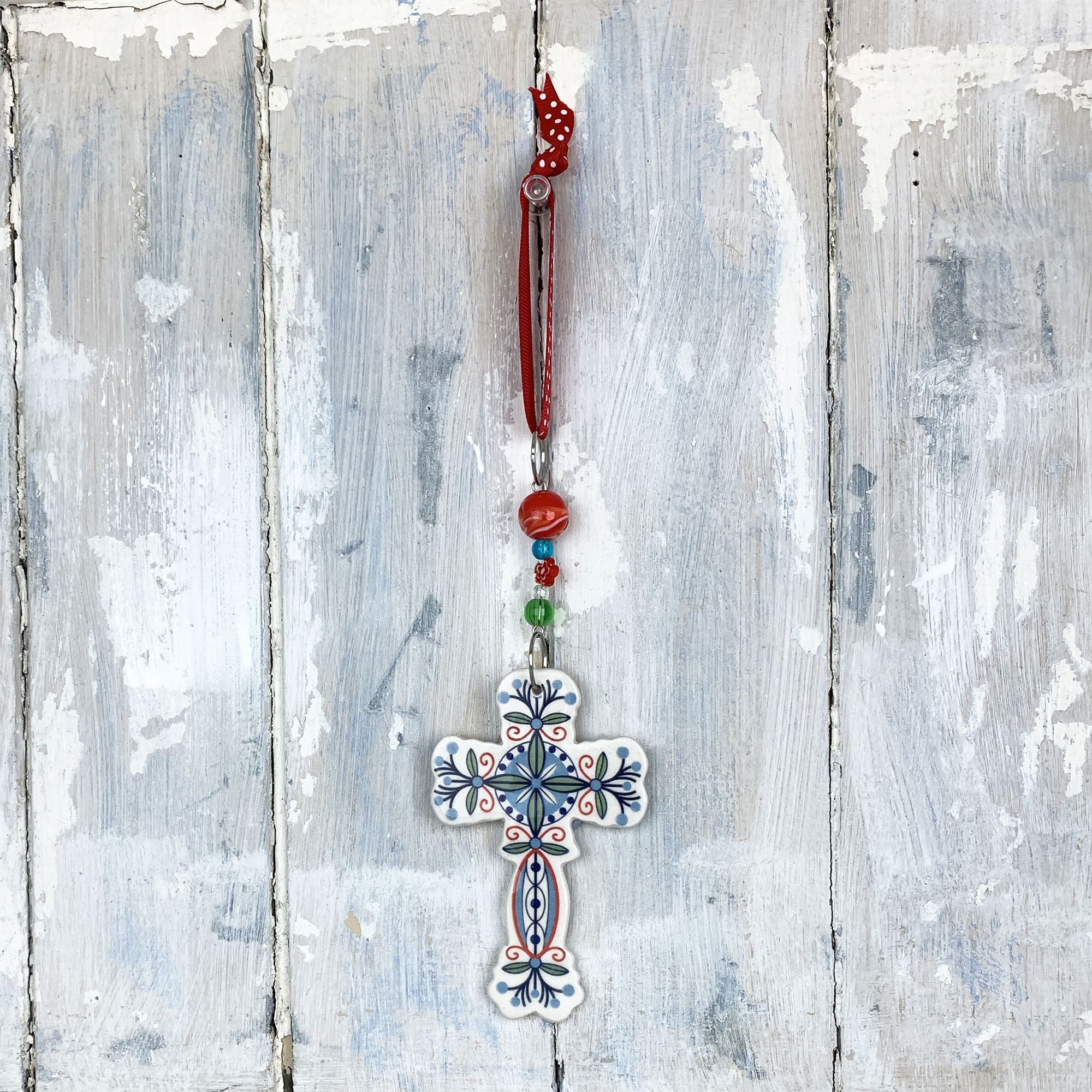 This ceramic Cross hanging decoration is handmade in the UK and finished with matching beads and ribbon. It measures approx. 9.5 cm tall, 6.5 cm wide, 4 mm thick and decorated on both sides.