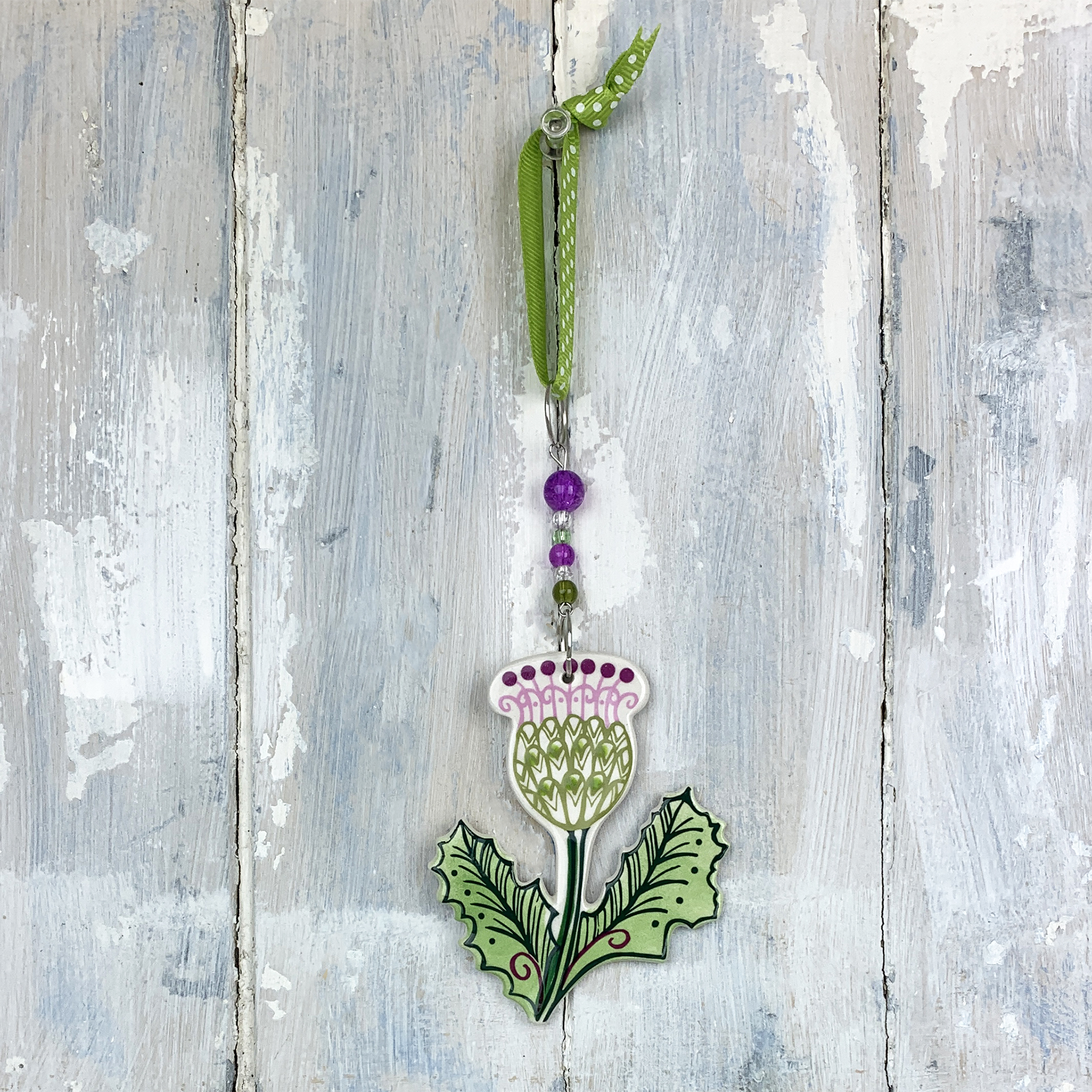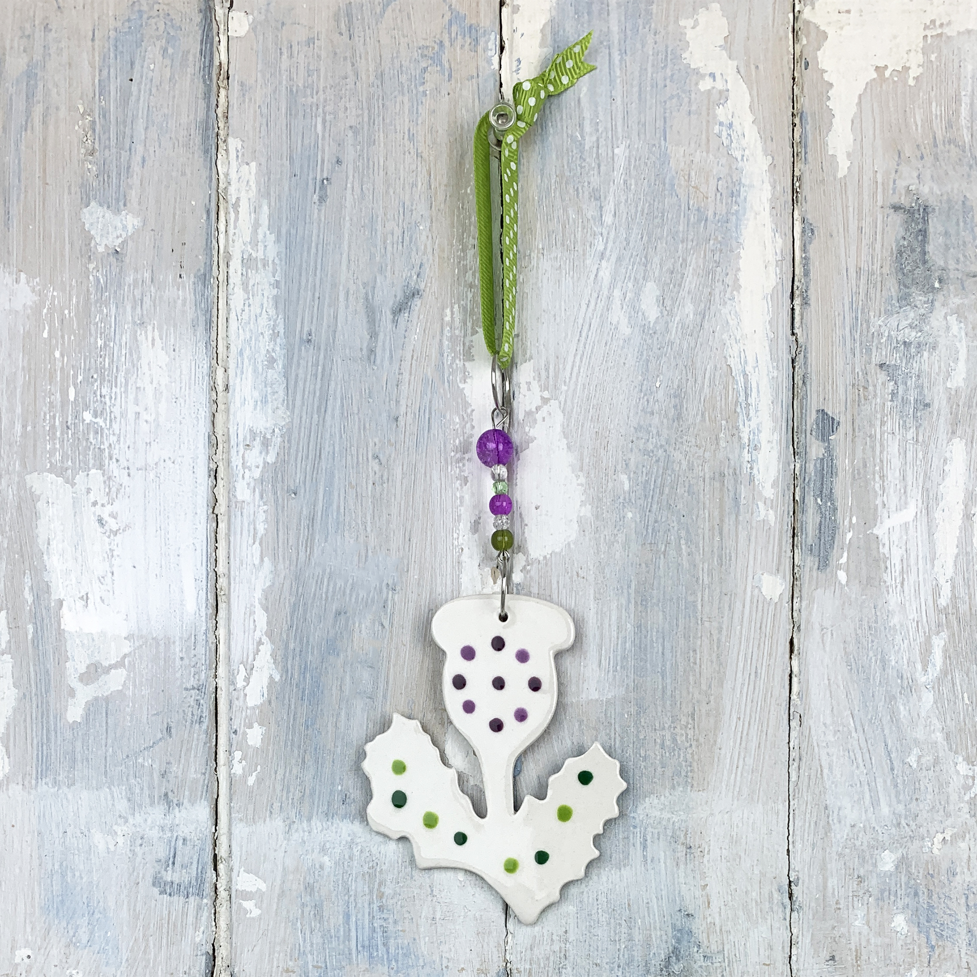 This ceramic Thistle hanging decoration is handmade in the UK and finished with matching beads and ribbon.